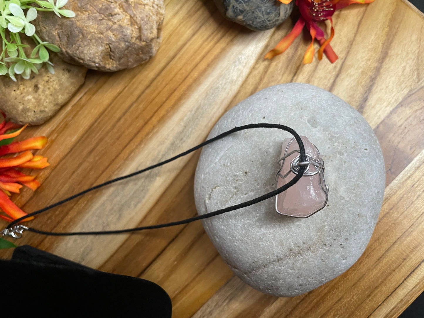 Rose Quartz Crystal Stone, Healing Necklace. 17” long black cord w/ 2” extension, 1.25” long and 1.30” wide. Silver round wrap.